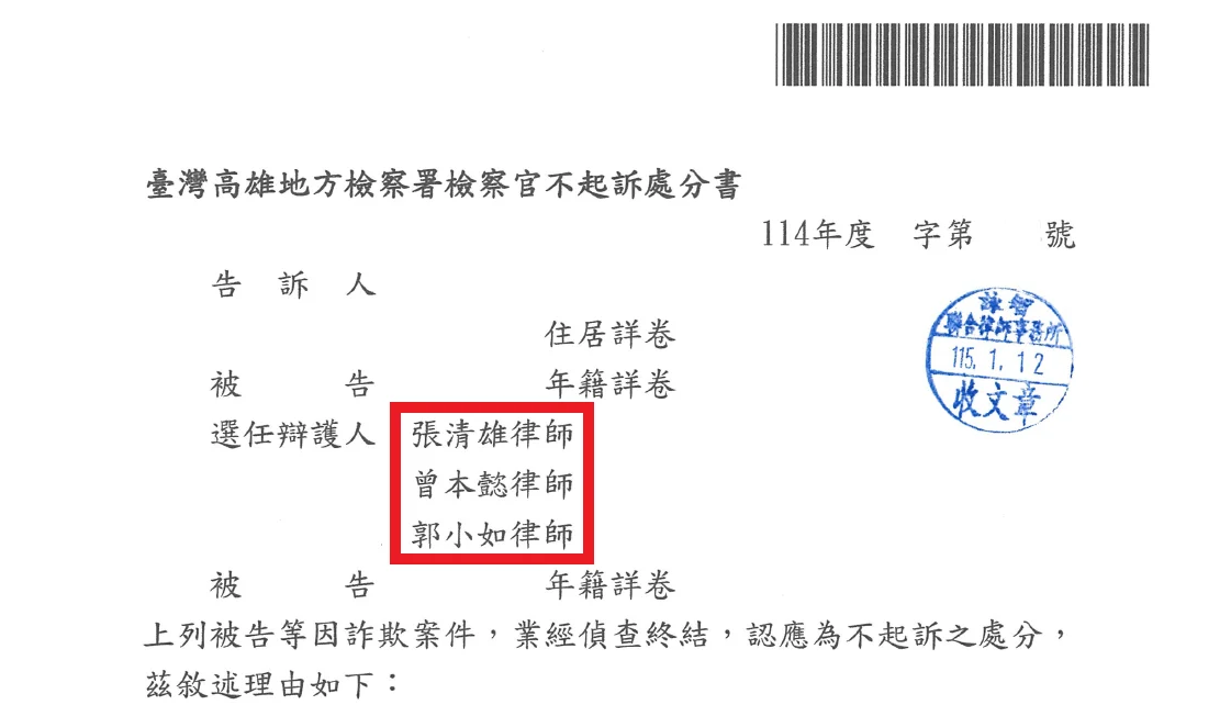 高雄律師推薦張清雄(07)2728828-客戶詐欺案件不起訴勝訴案例